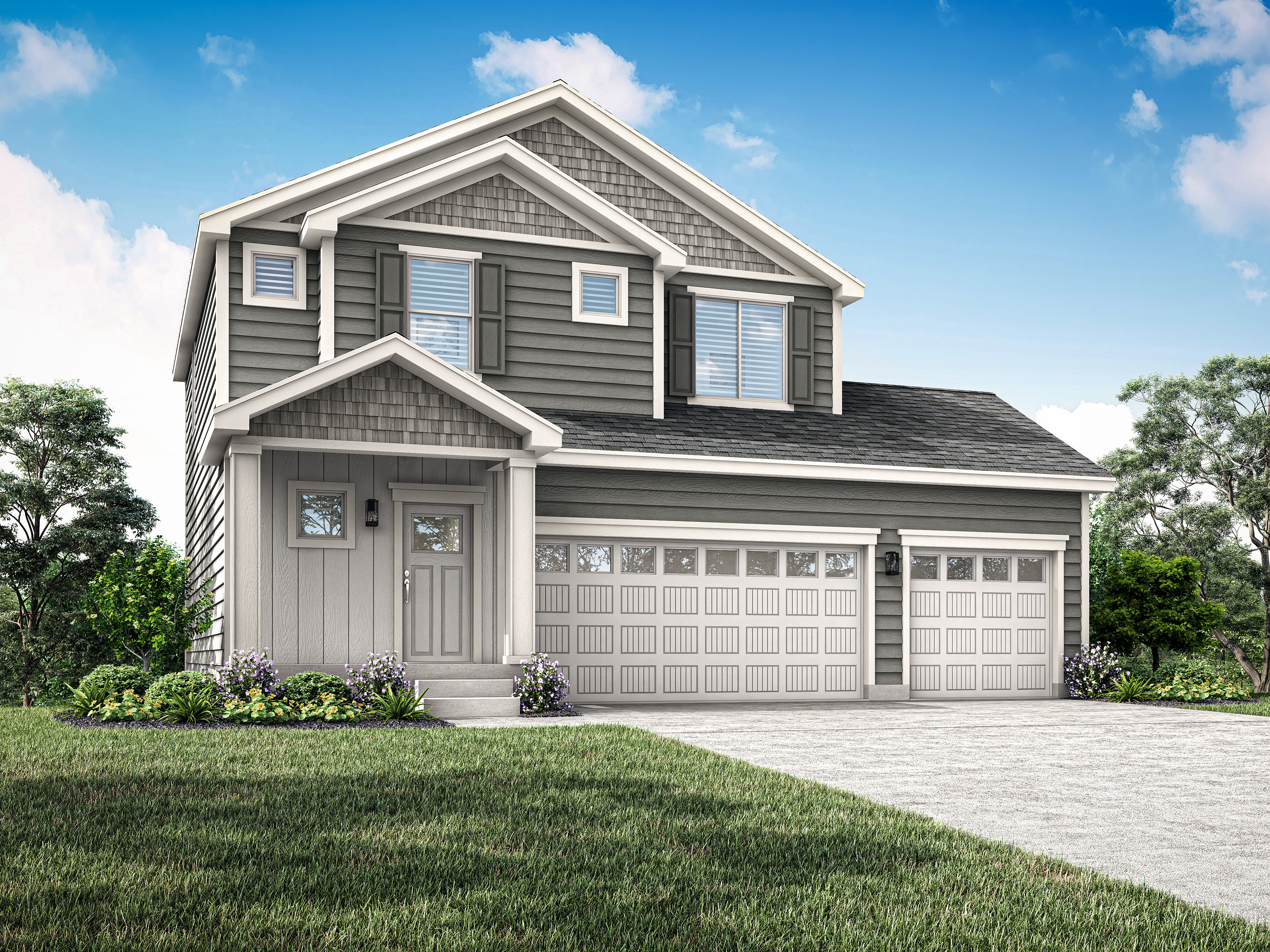 Alt attribute text: Photo of the two-story Granite plan by LGI Homes in with gray siding and shake siding and white trim.