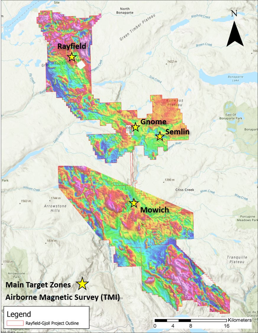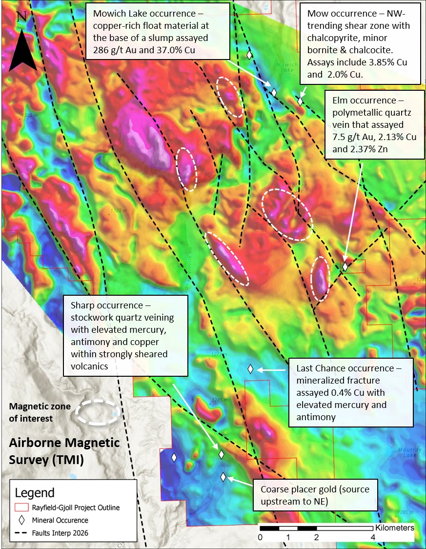 Figure 1: Project-wide results from the 2025 airborne magnetic survey outlining the main prospective targets for the Rayfield-Gjoll Copper-Gold Project.