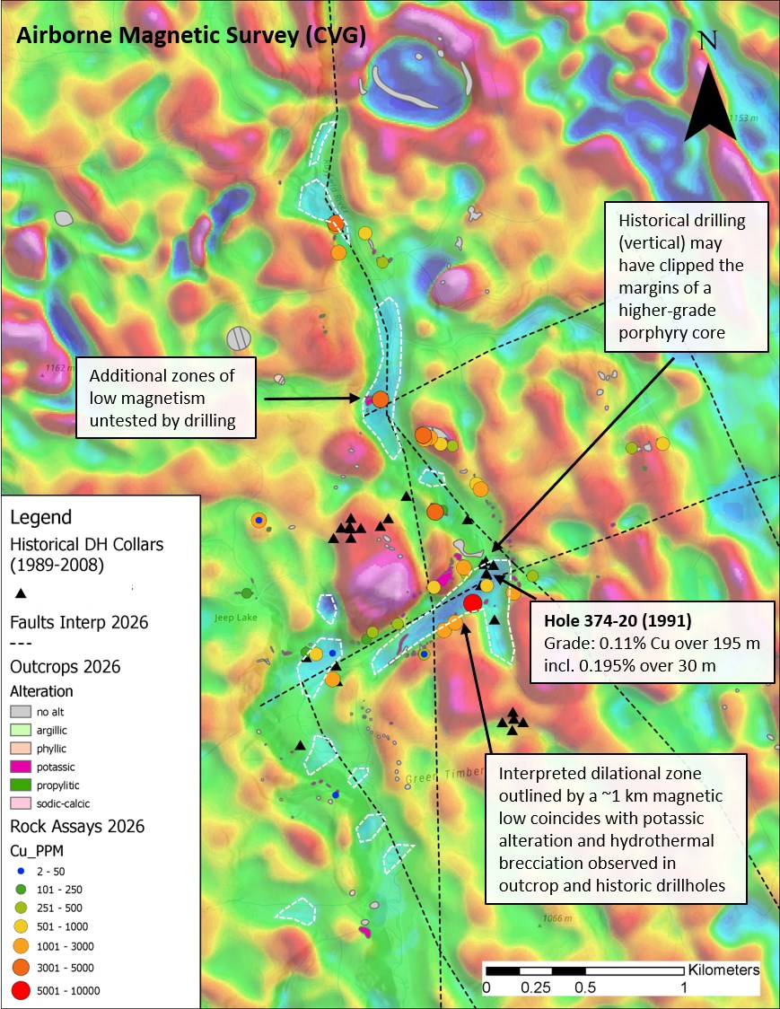 At the Rayfield target, an airborne magnetic survey completed in conjunction with a detailed geological mapping program in late 2025 delineated multiple magnetic low corridors (Figure 2). Geological mapping within these corridors identified zones of potassic and propylitic alteration that are spatially coincident with recently received copper grades of up to 9653.0 ppm Cu (0.96% Cu). These alteration zones are interpreted to be structurally controlled, consistent with fracture development evident in the magnetic data, allowing for potential fault-controlled fluid movement.