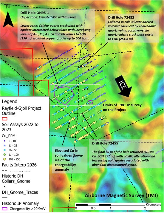 Figure 3: The 2025 airborne magnetic survey has identified a broad moderate magnetic anomaly that overlaps a historical geophysical IP anomaly from Scott, 1981 (AR09223). Elevated copper-in-soil values extending from this area further support the potential for a large mineralized system at depth. These results suggest that the phyllic/propylitic zone of a porphyry system may be exposed at the Gnome Target.